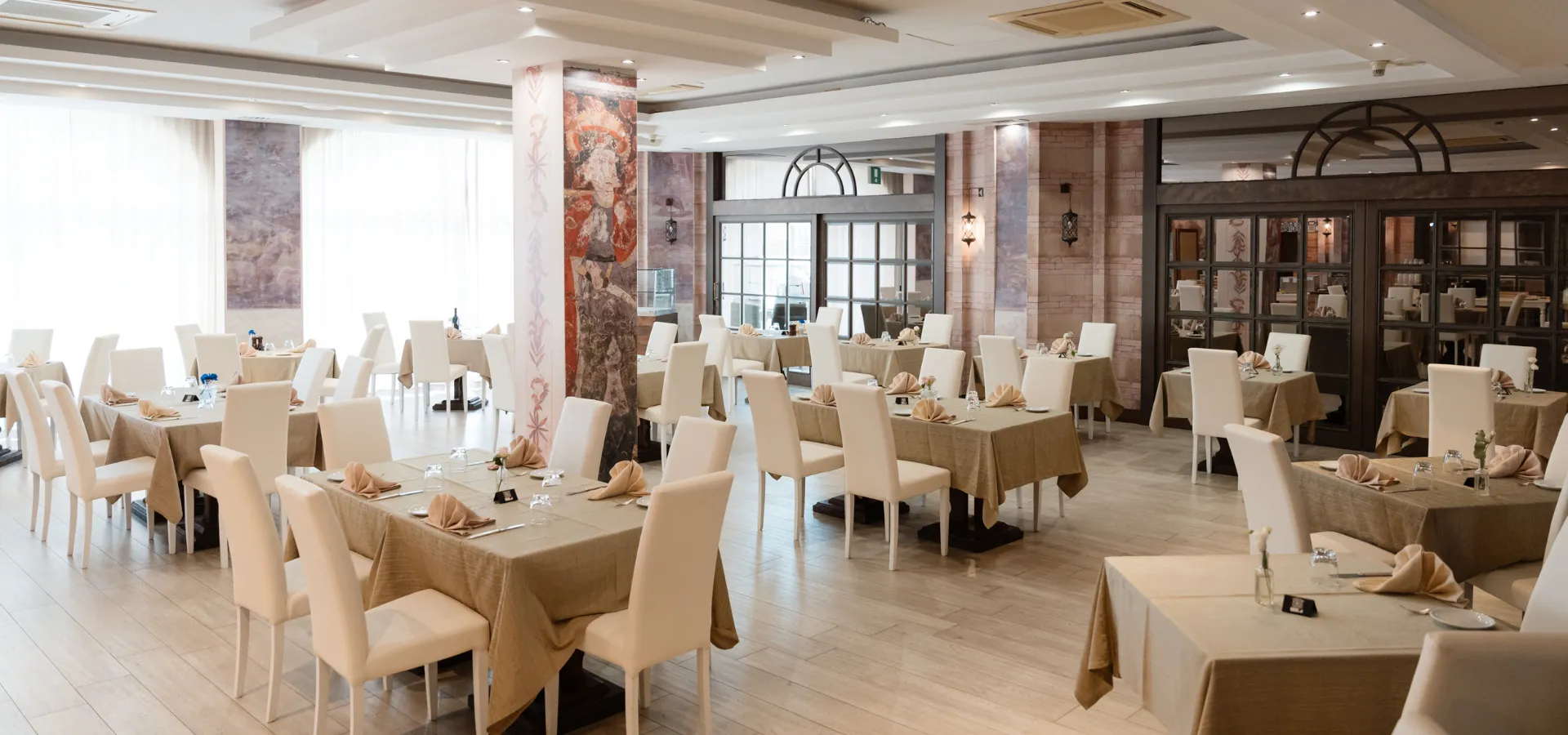 La magia si completa nella nostra sala panoramica e sulla terrazza che rievoca una suggestiva corte medievale, illuminata da lanterne, impreziosita da affreschi e scaldata dal fascino di una brace a vista: un luogo dove ogni pasto diventa esperienza.
